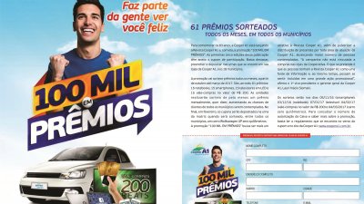 A Promoção 100 Mil em Prêmios está vinculada a Revista Cooper A1. Até março de 2017, serão sorteados prêmios todos os meses. Serão 15 smartphones; 15 notebooks; televisores; 28 vale-compras no valor de R$ 200, 00 e 1 carro 0 km.