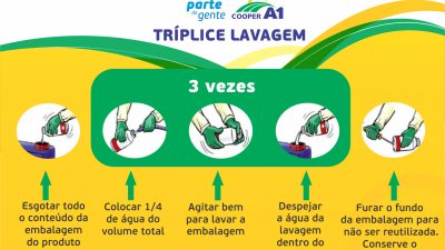 O engenheiro agrônomo da Cooper A1, Celiomar Jose Crestani, da unidade de Itapiranga, afirma que, para receber as embalagens e atender a legislação, alguns passos devem ser seguidos pelos produtores, afim de evitar complicações. “As embalagens devem ser tríplice lavadas, processo de enxaguar três vezes a embalagem vazia”, explica. Critérios que devem ser seguidos:- Após esvaziar a embalagem, deve ser colocada água limpa até ¼ de seu volume (25%);