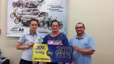Os ganhadores dos 24 vale-compras sorteados pela Cooper A1 no dia 26 deste mês, já estão retirando seus prêmios em mercadorias.  Este foi o sétimo sorteio da promoção, até o momento já foram contempladas 100 pessoas. A promoção acontece até setembro. Em fevereiro serão sorteados 20 tanquinhos e mais uma moto 0 KM.