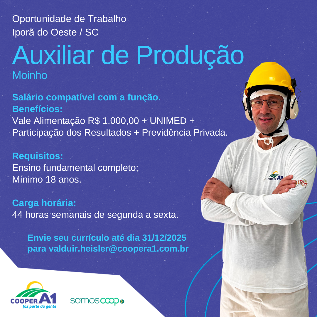 Descrição: Oportunidade para Auxiliar de Produção no moinho de farinhas.